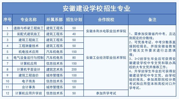 安徽建设学校创办于1984年,是一所全日制省属公办普通中专学校,国家重点,全国首批改革与发展示范学校,首批国家示范鉴定站,中国建设教育先进单位,国家技能人才培育突出贡献奖获得者,职教集团理事长单位,安徽省文明单位,合肥市职业教育先进单位,现代鲁班的摇篮。